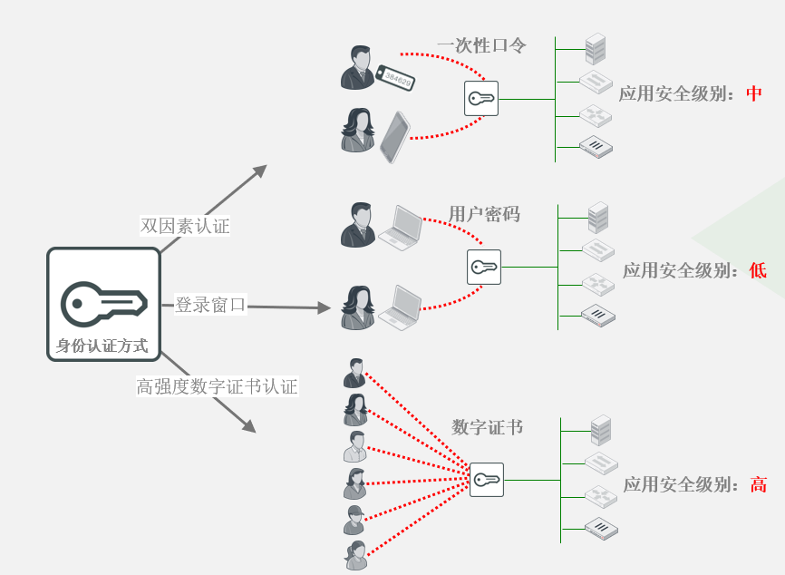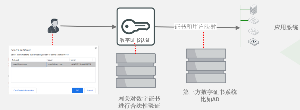 数字证书认证:和第三方PKI证书系统进行客户端的数字证书认证,适合高安全性的应用环境