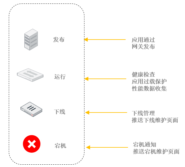 网关对所有发布的应用进行整个生命周期的管理,涵盖发布、运行、下线和宕机的维护.